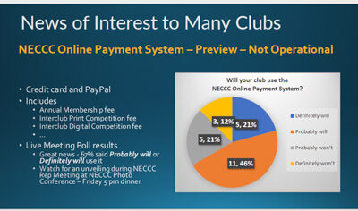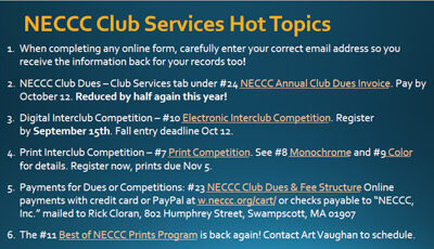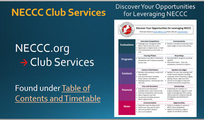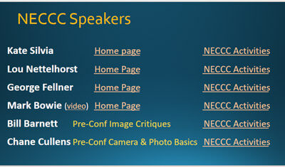 7:30 – Meeting kickoff – Chane Cullens. . Any news. . 7:35 – NECCC hot topics – Rhonda Cullens. . NECCC Photo Conference – registration …