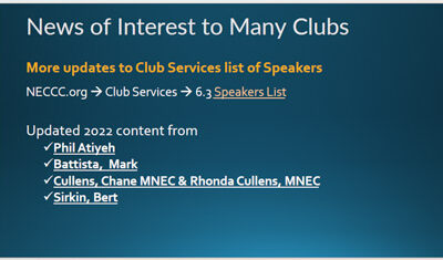 7:30 – Meeting kickoff – Chane Cullens. . 7:35 – NECCC hot t. . NECCC Club Services Page. . Option to pay NECCC fees online. . Print …