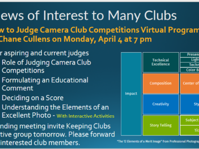 7:30 – Meeting kickoff – Chane Cullens. . Now April 4, How to Judge Camera Club Competitions for any interested club members. . 7:35 – …