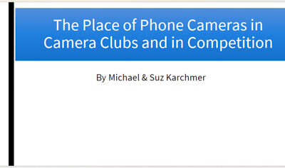 7:30 – Meeting kickoff – Chane Cullens. . 7:35 – Michael & Suz Karchmer – The Place of Phone Cameras in Camera Clubs and in Competition. …