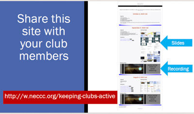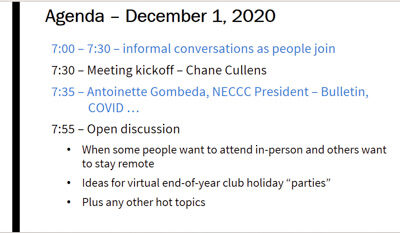 7:30 – Meeting kickoff – Chane Cullens. . 7:35 – Antoinette Gombeda, NECCC President – COVID & Fall Bulletin. . 7:50 – Discussion topics …