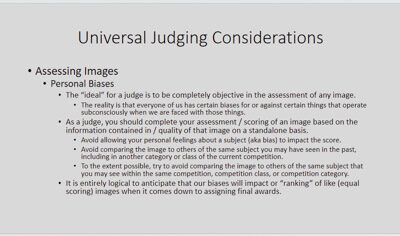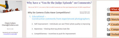 The NECCC Miniseries of educational discussions and presentations is designed to enhance the experience of participating in camera club competitions. These episodes are free and open to everyone. Information about the online meetings, including the date and time, is sent out to the NECCC mailing list in advance, with a reminder sent to registered attendees closer to the event date. The episodes below include video of the online session, and handouts where applicable.